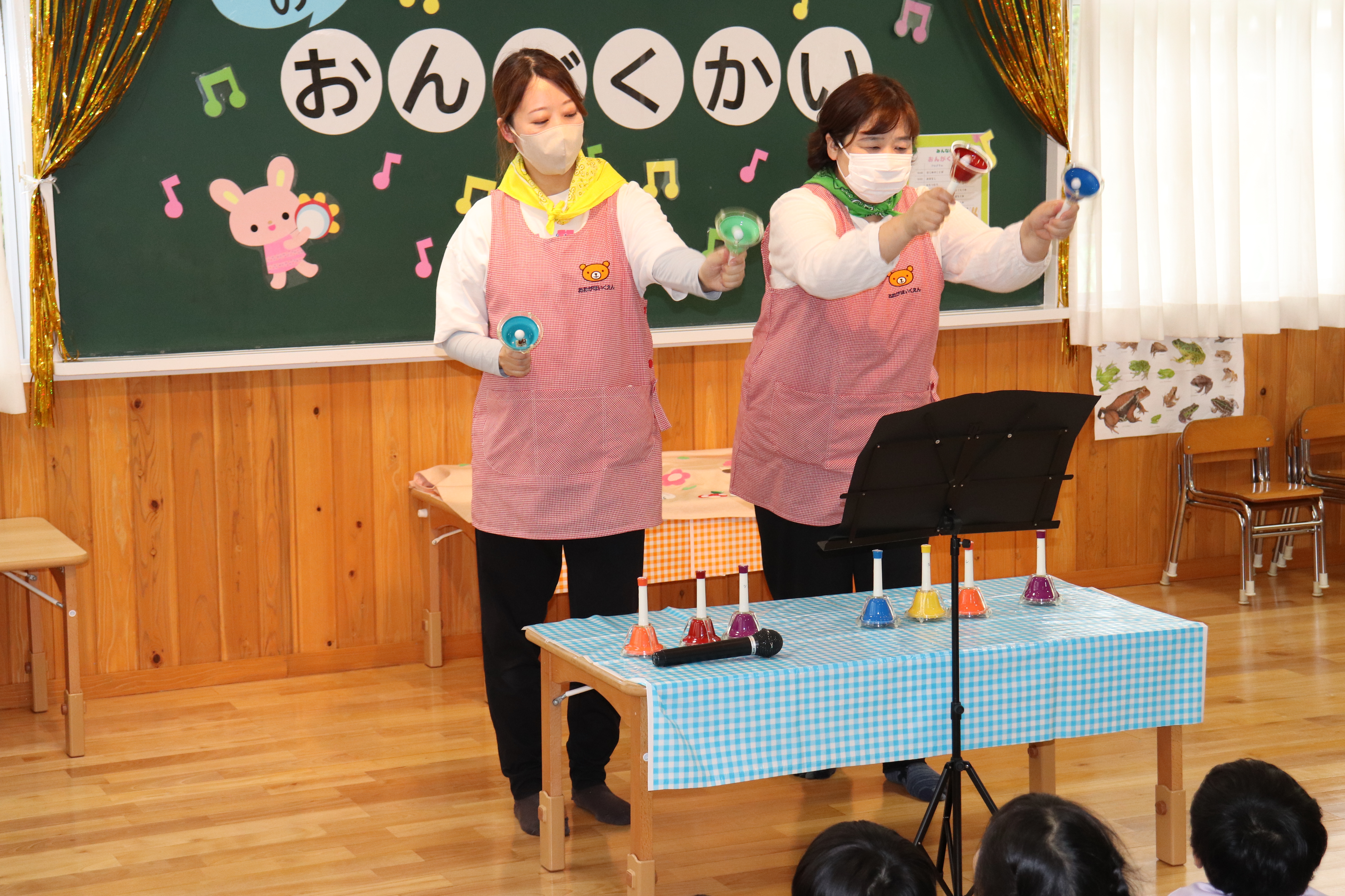 12月2日(火)9:00より、2歳児~5歳児クラスで人形劇の観劇をしました。今年も「劇団すぎのこ」さんにおいでいただき、導入の「おおきなかぶ」「てあそび」の後、「マーリャンとまほうのふで」を見ました。「おおきなかぶ」では、こどもたちも一緒にかけ声をかけてかぶを引き抜き、「てあそび」で身体をほぐした後、「マーリャンとまほうのふで」を見ました。ほとんどのこどもたちにとっては初めてのお話で、みな真剣に見入っていました。