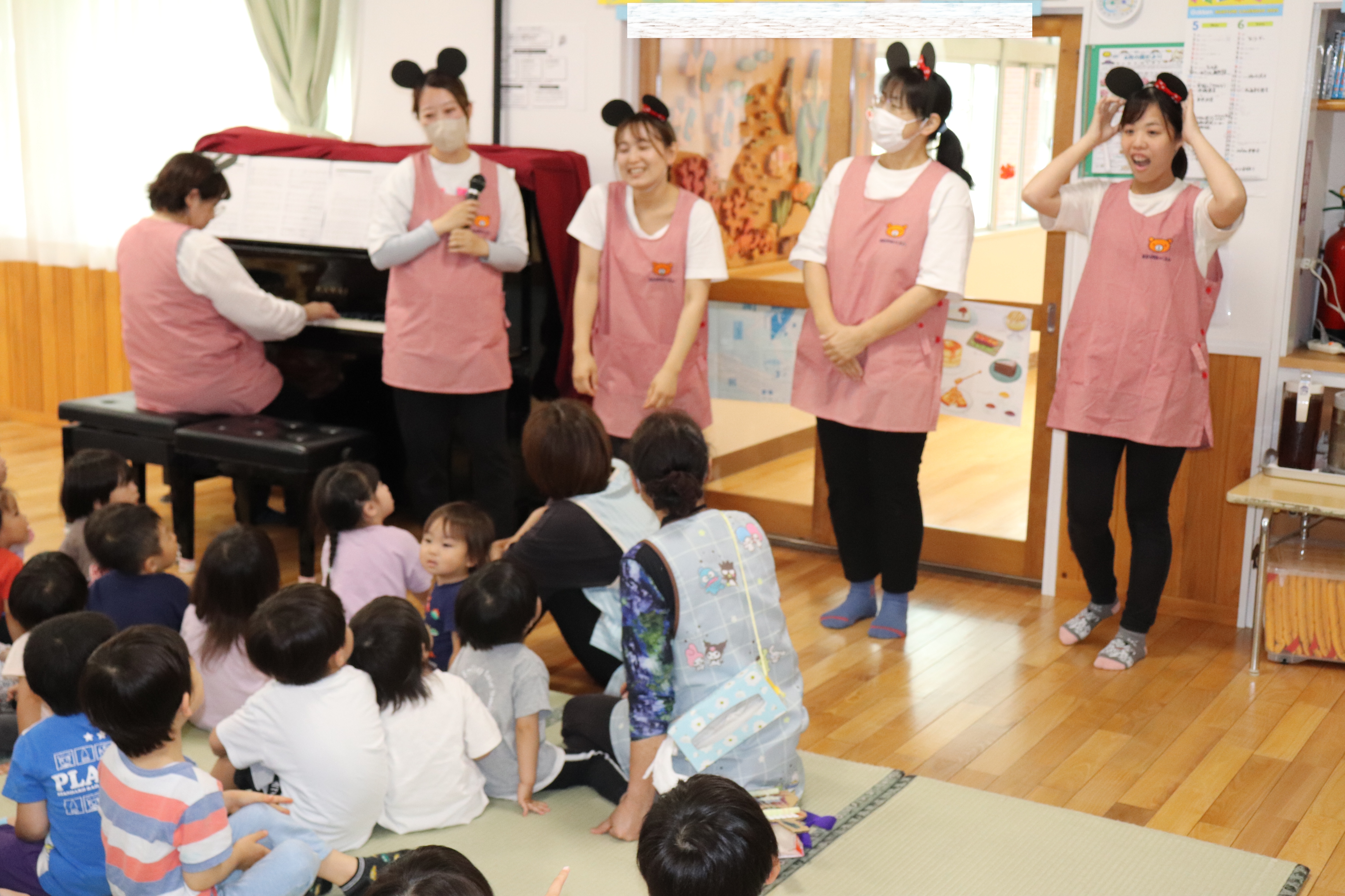 12月2日(火)9:00より、2歳児~5歳児クラスで人形劇の観劇をしました。今年も「劇団すぎのこ」さんにおいでいただき、導入の「おおきなかぶ」「てあそび」の後、「マーリャンとまほうのふで」を見ました。「おおきなかぶ」では、こどもたちも一緒にかけ声をかけてかぶを引き抜き、「てあそび」で身体をほぐした後、「マーリャンとまほうのふで」を見ました。ほとんどのこどもたちにとっては初めてのお話で、みな真剣に見入っていました。