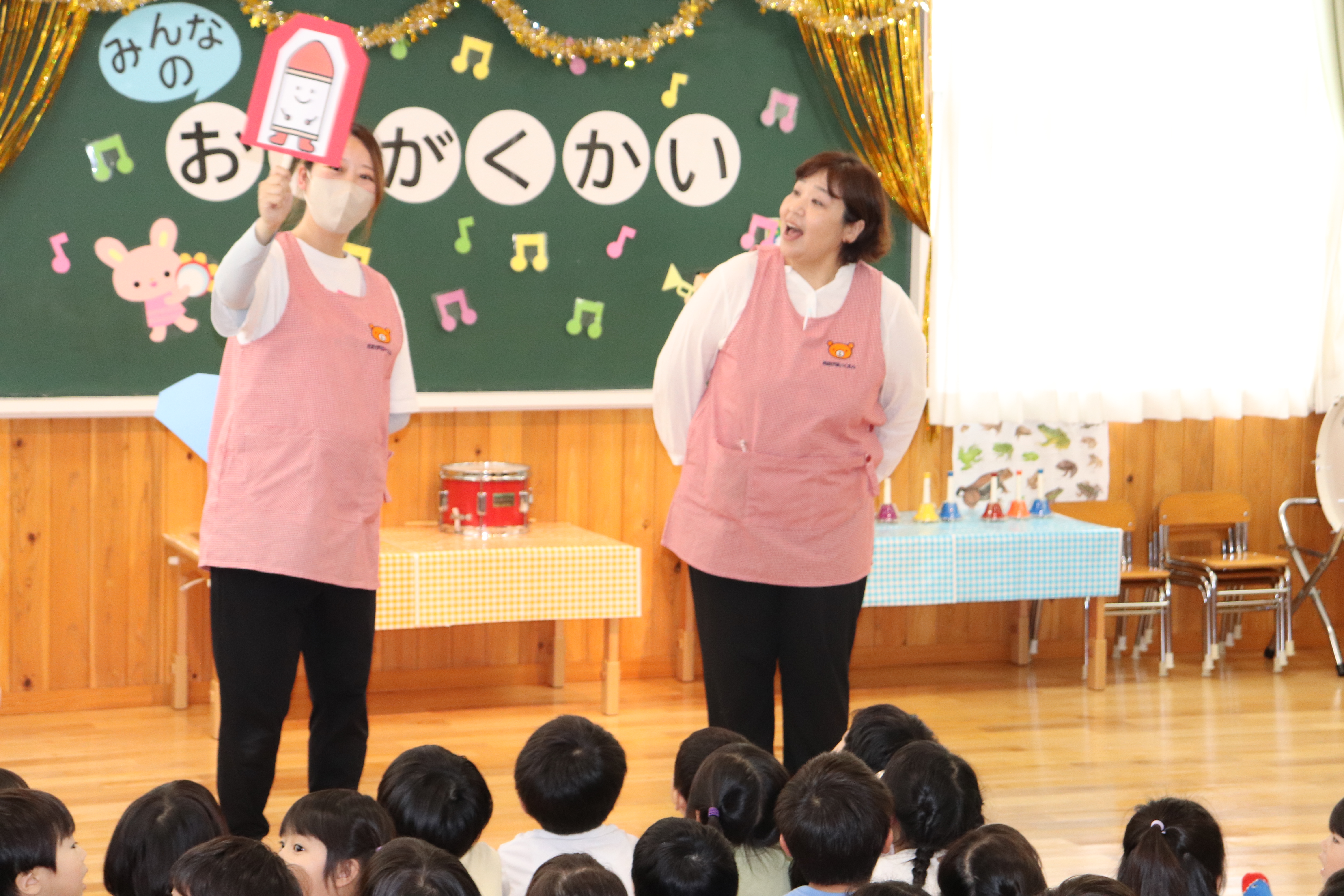 12月2日(火)9:00より、2歳児~5歳児クラスで人形劇の観劇をしました。今年も「劇団すぎのこ」さんにおいでいただき、導入の「おおきなかぶ」「てあそび」の後、「マーリャンとまほうのふで」を見ました。「おおきなかぶ」では、こどもたちも一緒にかけ声をかけてかぶを引き抜き、「てあそび」で身体をほぐした後、「マーリャンとまほうのふで」を見ました。ほとんどのこどもたちにとっては初めてのお話で、みな真剣に見入っていました。