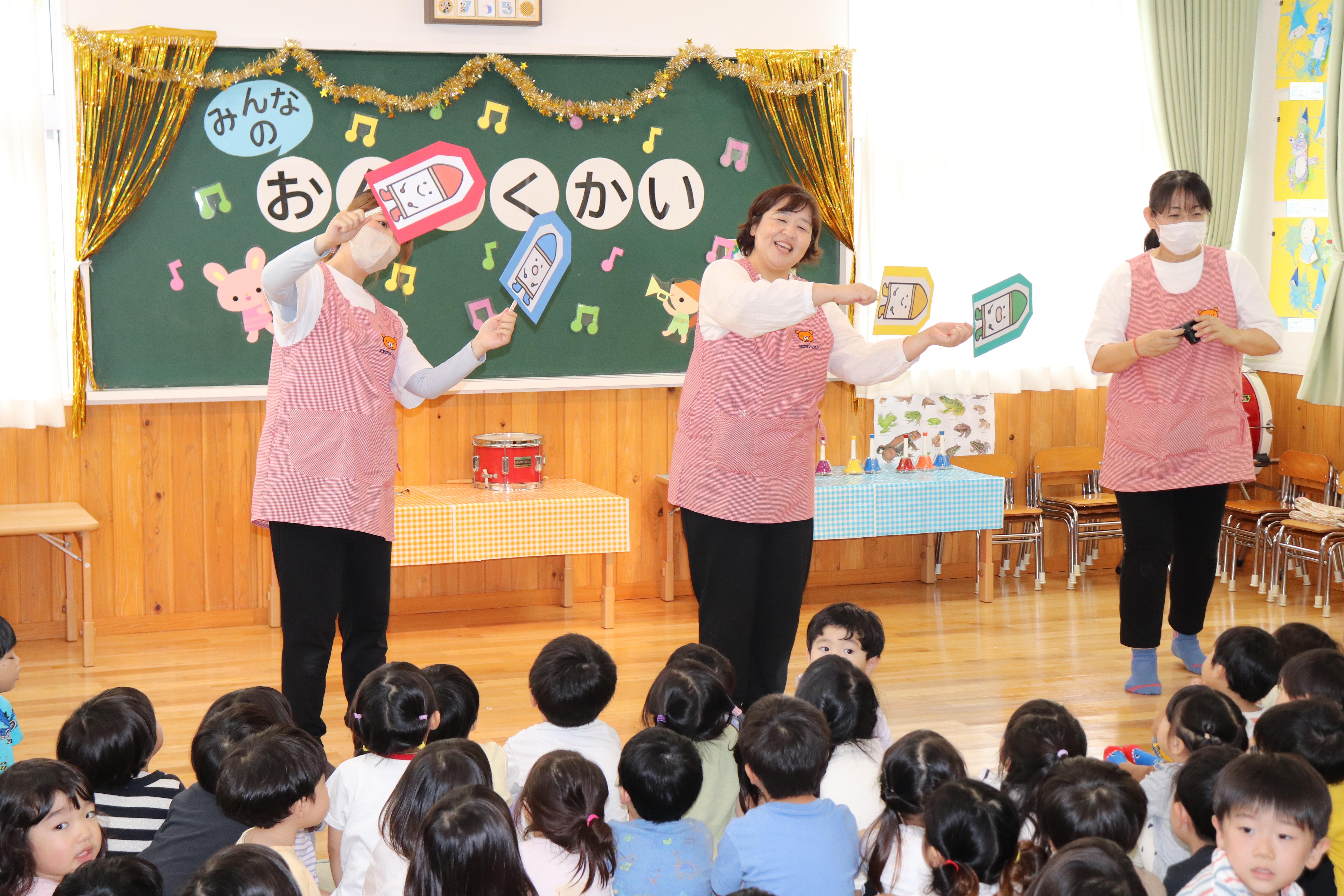 12月2日(火)9:00より、2歳児~5歳児クラスで人形劇の観劇をしました。今年も「劇団すぎのこ」さんにおいでいただき、導入の「おおきなかぶ」「てあそび」の後、「マーリャンとまほうのふで」を見ました。「おおきなかぶ」では、こどもたちも一緒にかけ声をかけてかぶを引き抜き、「てあそび」で身体をほぐした後、「マーリャンとまほうのふで」を見ました。ほとんどのこどもたちにとっては初めてのお話で、みな真剣に見入っていました。