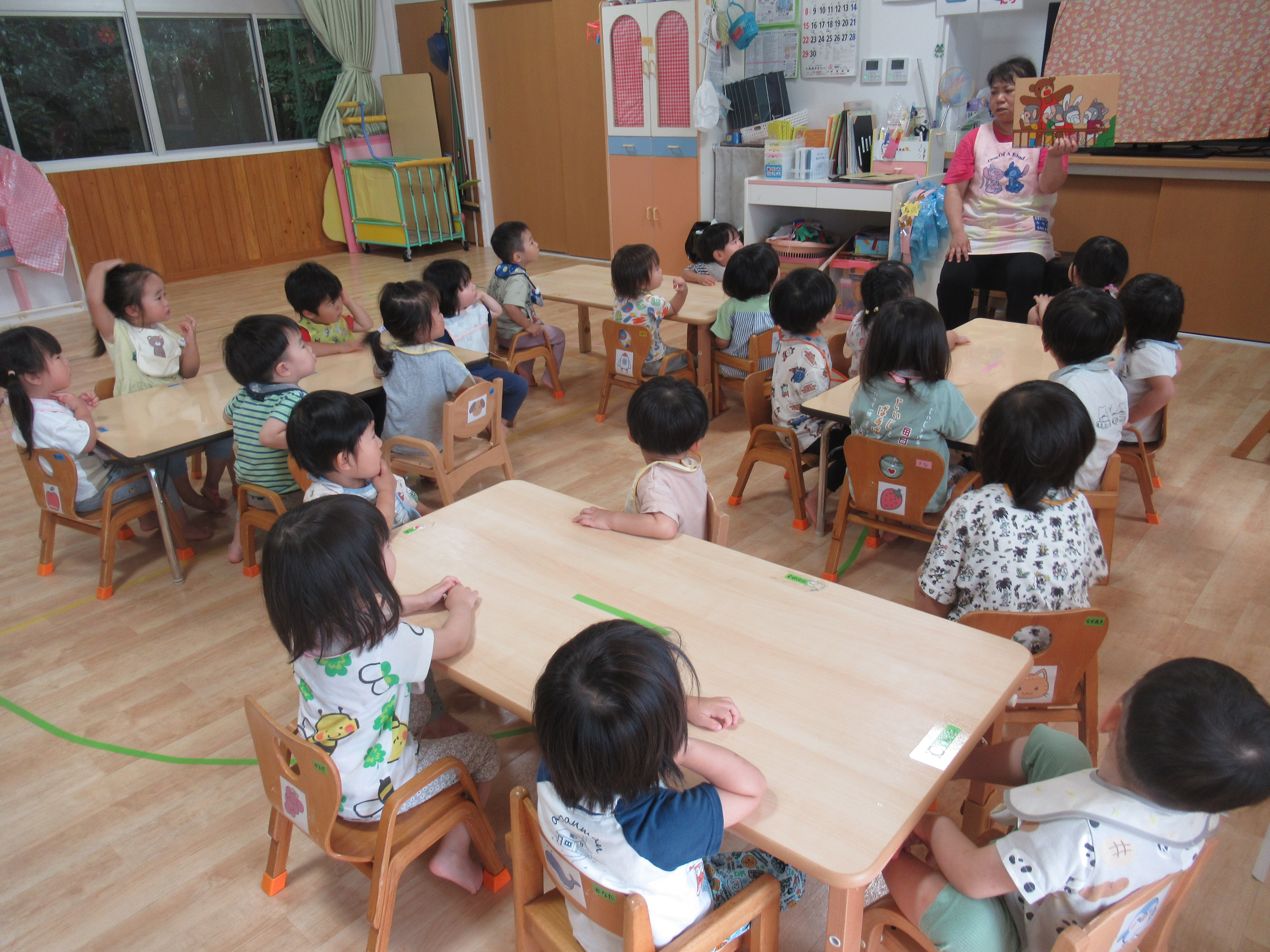 12月2日(火)9:00より、2歳児~5歳児クラスで人形劇の観劇をしました。今年も「劇団すぎのこ」さんにおいでいただき、導入の「おおきなかぶ」「てあそび」の後、「マーリャンとまほうのふで」を見ました。「おおきなかぶ」では、こどもたちも一緒にかけ声をかけてかぶを引き抜き、「てあそび」で身体をほぐした後、「マーリャンとまほうのふで」を見ました。ほとんどのこどもたちにとっては初めてのお話で、みな真剣に見入っていました。