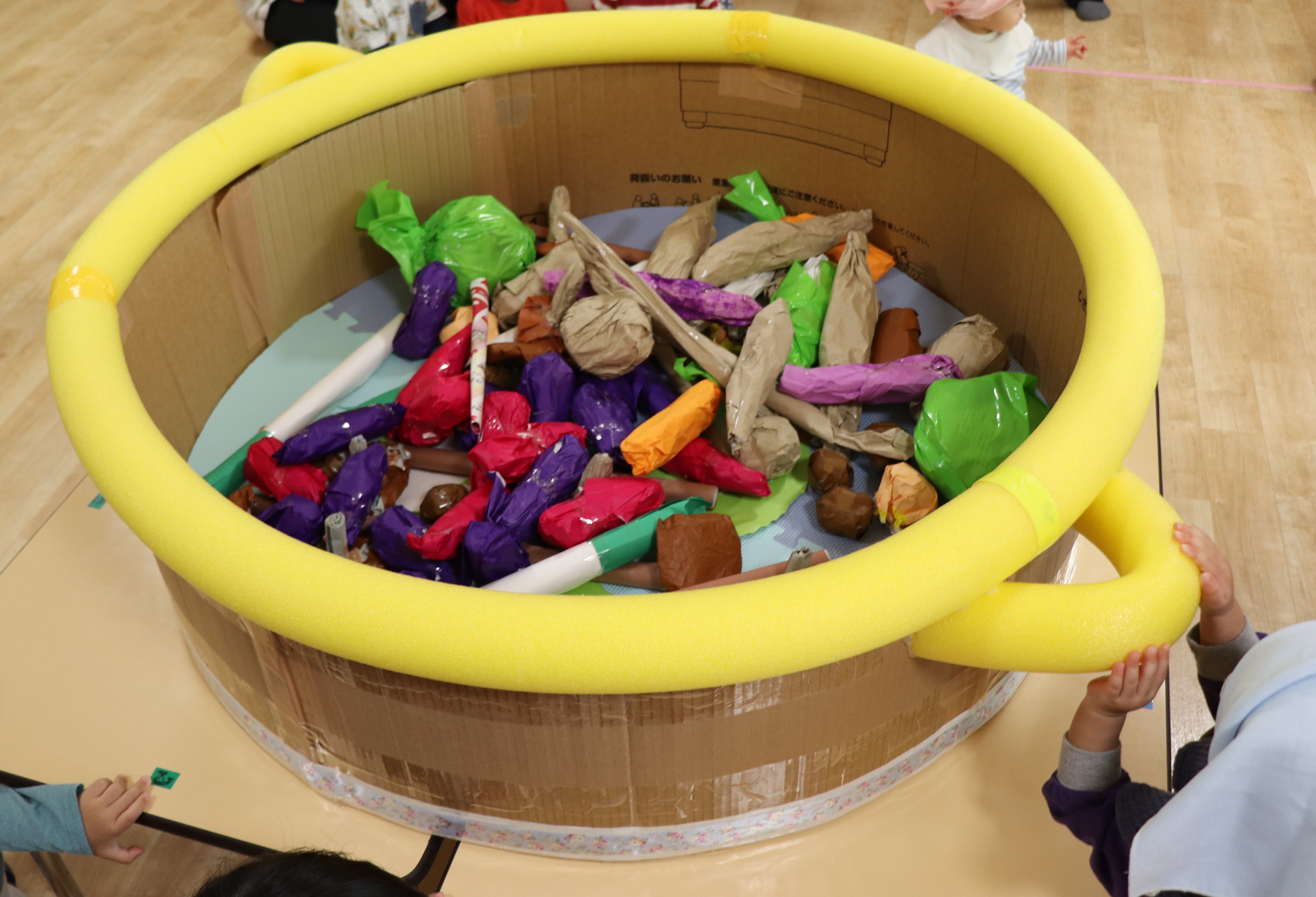 12月2日(火)9:00より、2歳児~5歳児クラスで人形劇の観劇をしました。今年も「劇団すぎのこ」さんにおいでいただき、導入の「おおきなかぶ」「てあそび」の後、「マーリャンとまほうのふで」を見ました。「おおきなかぶ」では、こどもたちも一緒にかけ声をかけてかぶを引き抜き、「てあそび」で身体をほぐした後、「マーリャンとまほうのふで」を見ました。ほとんどのこどもたちにとっては初めてのお話で、みな真剣に見入っていました。